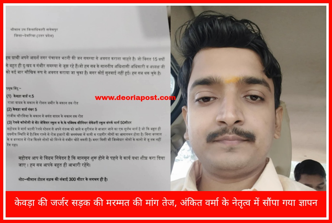 भटनी नगर पंचायत के हरिकीर्तन मोहल्ला निवासी अंकित वर्मा के नेतृत्व में स्थानीय नागरिकों ने केवड़ा में वर्षों से जर्जर पड़ी सड़क की मरम्मत की मांग उठाई है। क्षेत्रवासियों का कहना है कि हर साल बरसात के मौसम में सड़क पर जलभराव की स्थिति उत्पन्न हो जाती है, जिससे आवागमन मुश्किल हो जाता है और दुर्घटनाएं आम हो जाती हैं।