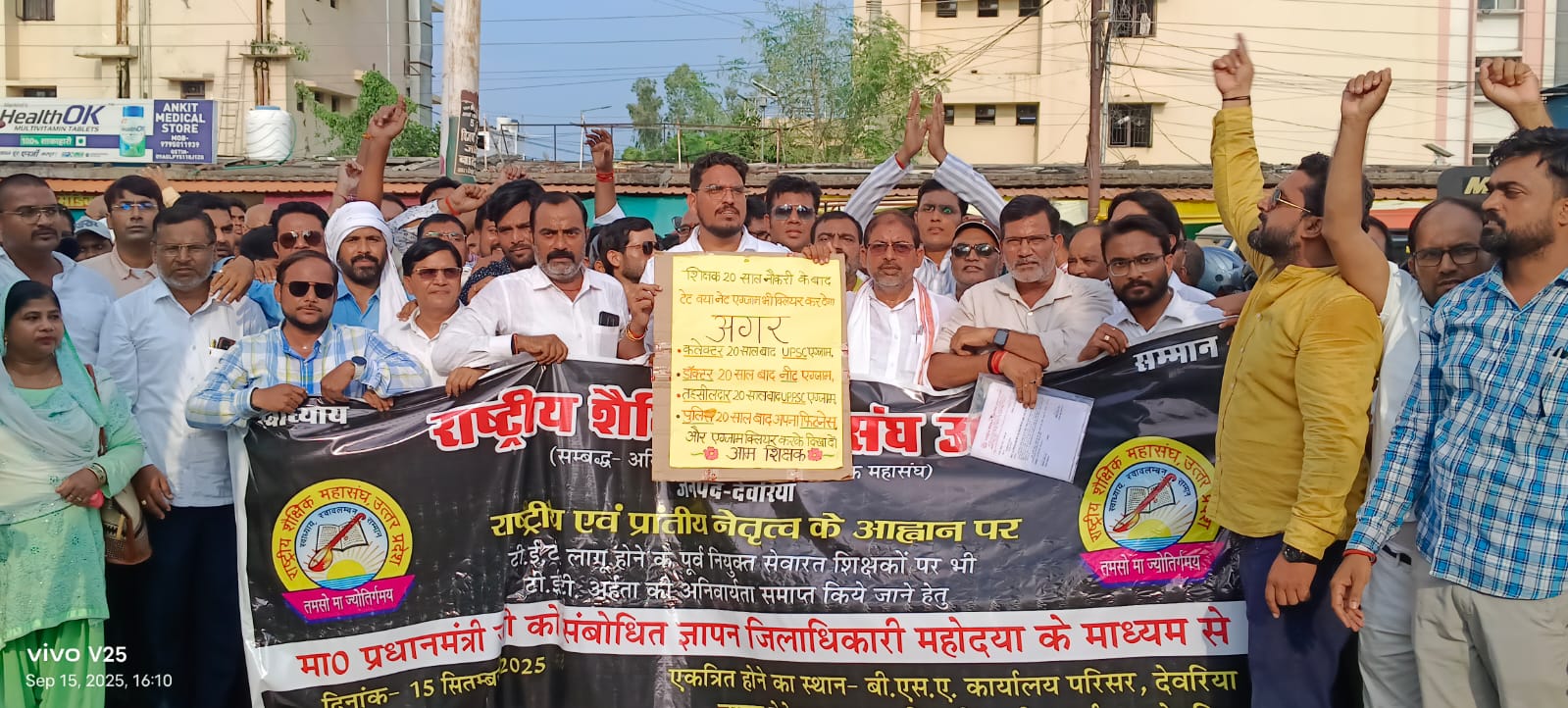 देवरिया। राष्ट्रीय शैक्षिक महासंघ के बैनर तले जिले के हजारों शिक्षकों ने सोमवार को ज़िला मुख्यालय पर प्रदर्शन करते हुए डीएम के माध्यम से प्रधानमंत्री को ज्ञापन सौंपा। शिक्षकों ने सेवारत शिक्षकों के लिए टीईटी अनिवार्य किए जाने के निर्णय को अव्यावहारिक और अनुचित बताया।