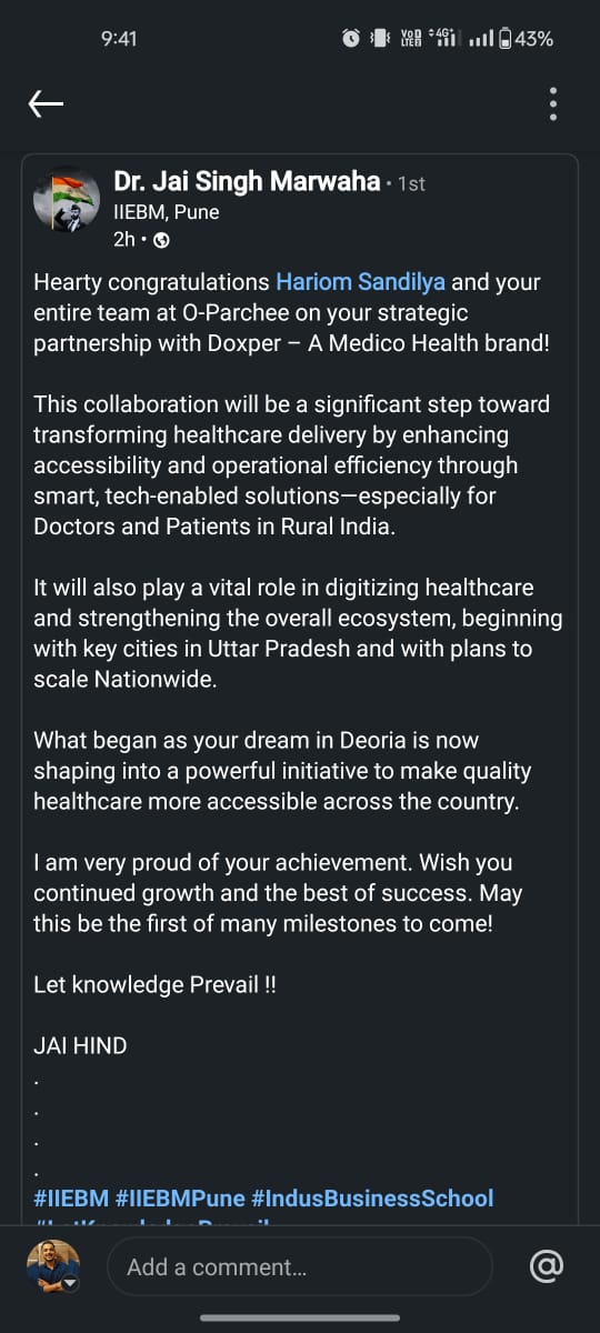 “यह केवल देवरिया या पूर्वांचल की जीत नहीं है – यह हर छोटे शहर के सपनों की जीत है। हमारा सपना है कि O-Parchee के ज़रिए गाँवों में भी स्मार्ट हेल्थकेयर पहुंचे।”