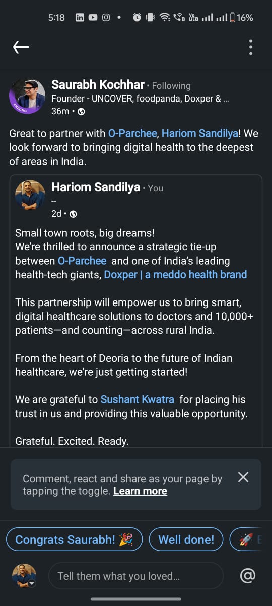 अब O-Parchee ने हाथ मिलाया है देश की अग्रणी हेल्थटेक कंपनी Doxper के साथ, जिसकी वैल्यूएशन 250 करोड़ रुपये से भी अधिक है। यह करार केवल एक बिज़नेस डील नहीं, बल्कि गाँवों की गलियों में उमड़ती उम्मीदों की आवाज़ है।