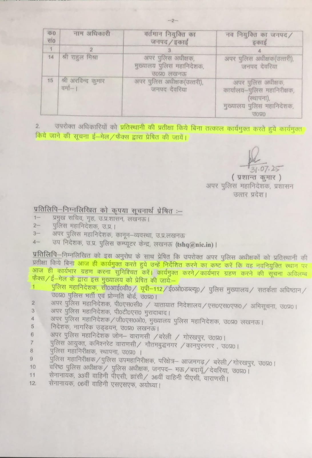 इस फेरबदल में देवरिया जिले के ASP अरविंद कुमार का तबादला कर दिया गया है। उनकी जगह अब राहुल मिश्र को देवरिया का नया अपर पुलिस अधीक्षक नियुक्त किया गया है। माना जा रहा है कि यह बदलाव जिले की सुरक्षा व्यवस्था और अपराध नियंत्रण में और मजबूती लाएगा।
