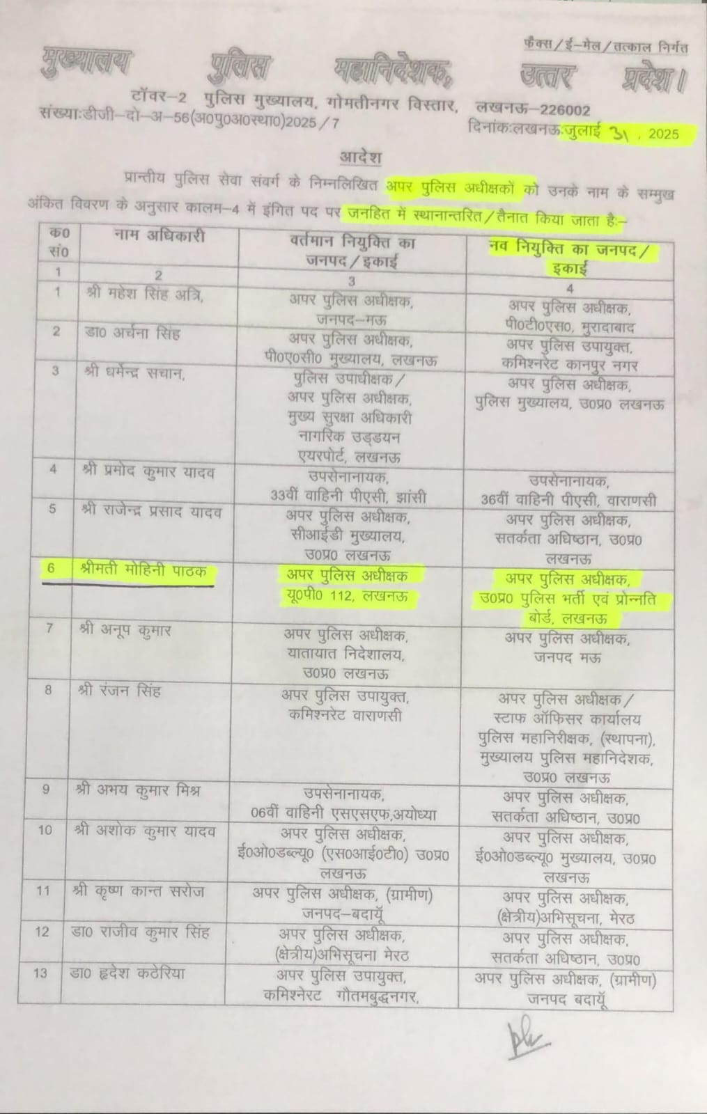 उत्तर प्रदेश सरकार ने एक बार फिर पुलिस महकमे में बड़ा प्रशासनिक कदम उठाया है। बुधवार को राज्य सरकार द्वारा जारी आदेश में 15 अपर पुलिस अधीक्षकों (ASP) के तबादले किए गए हैं। यह कदम राज्य की कानून-व्यवस्था को और अधिक प्रभावी बनाने और प्रशासनिक कार्यों में तेजी और पारदर्शिता लाने के उद्देश्य से उठाया गया है।